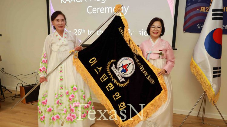 사진/ 텍사스N (오스틴 한인회 이옥희 전임 회장(사진 오른쪽)이 강수지 신임회장(왼쪽)에게 한인회기를 전달한 뒤 기념사진을 찍고 있다.) 오스틴 한인회가 제27대...
