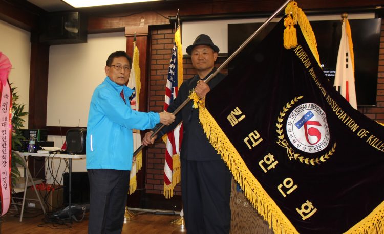 사진/ 킬린 한인회 제공 (킬린 한인회 정필원 전 회장이 이강일 회장에게 한인회기를 전달하고 있다.) 제40대 킬린 한인회장 취임식이 21일(토)...