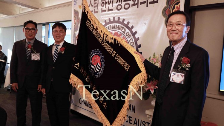 미주한인상공회의소총연합회가 마련한 오스틴 한인상공회의소 깃발을 미주한상총연 강문선 수석부회장(왼쪽)과 오스틴 한인상공회 한상률 전 회장(오른쪽)이 신임 남종규 회장(왼쪽에서 두번째)에게 전달한...
