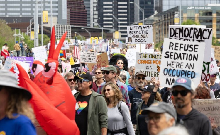 사진/ 텍사스퍼블릭라디오(Thousands of demonstrators march from Austin City Hall to Auditorium shores during Saturday's "No Kings" protest.) 2026년...