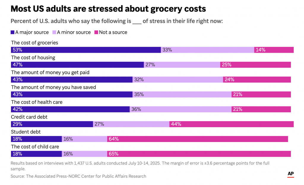 AP통신과 NORC 공공문제연구센터(AP-NORC)가 7월 10일부터 14일까지 성인 1,437명을 대상으로 실시한 여론조사에 따르면, 응답자의 약 50%는 식료품 가격이 ‘심각한 스트레스’ 요인이라고 답했으며, 33%는 ‘경미한 스트레스’ 요인이라고 응답했다. 단지 14%만이 스트레스를 느끼지 않는다고 답해, 식료품비 부담이 미국 사회 전반에 깊이 퍼져 있음을 보여준다고 AP는 보도했다.