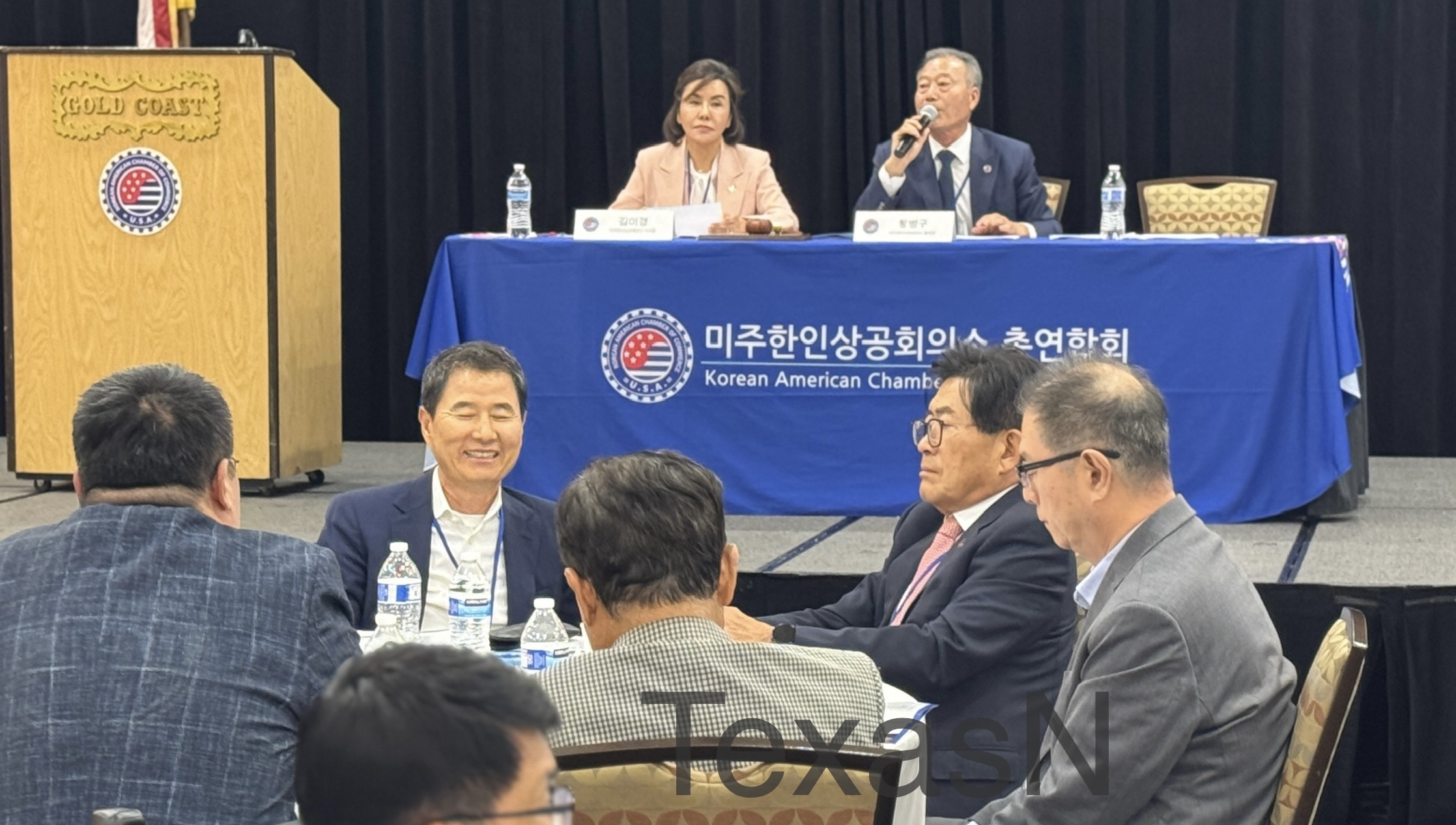[사진=텍사스N]  미주한인상공회의소총연합회 총회를 진행하고 있는 김미경 이사장과 황병구 총회장.