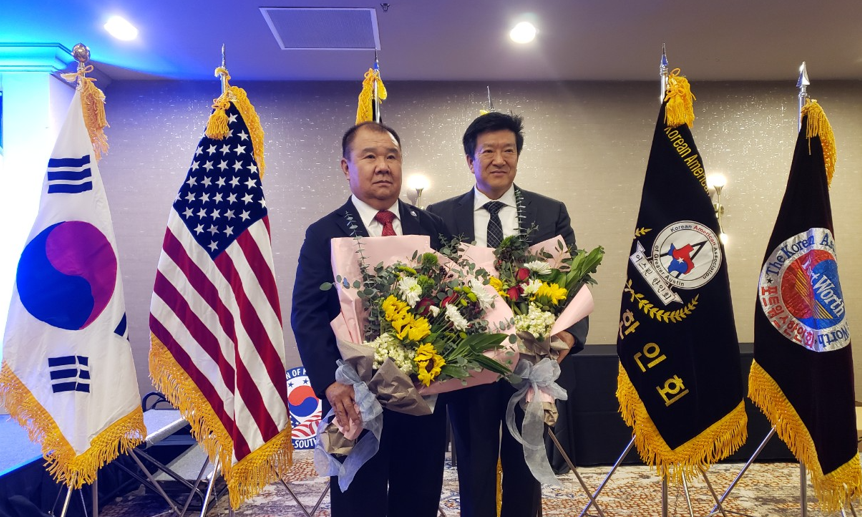 사진/ 미주한인회 중남부연합회 제공 (21대 김도수 신임회장(사진왼쪽)과 고경열 회장(오른쪽)이 이취임식 후 기념사진을 찍고 있다.