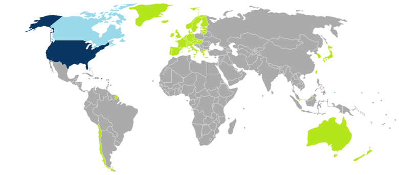 - 아시아: 브루나이, 일본, 싱가포르, 대한민국, 대만
