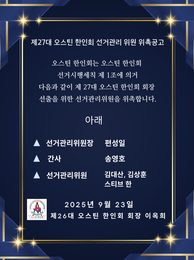 지난 23일자로 위촉절차를 마치고 한인사회에 공고한 선거관리위원회는 27대 오스틴 한인회장 선출과 관련한 선거일정 결정 및 관리 임무에 들어가게 된다.