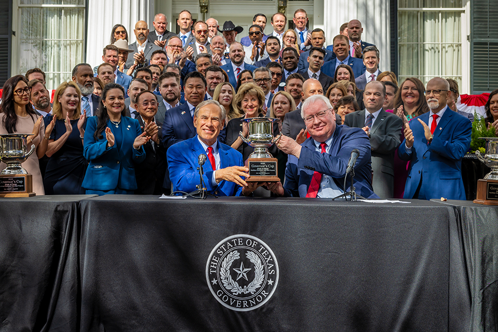 사진/ Site Selection Executive Vice President Ron Starner presents the Governor’s Cup trophy to Governor Greg Abbott at the Governor’s Mansion in Austin on March 2. [Photo: Eduardo Leal (TGA)/Office of the Texas Governor]