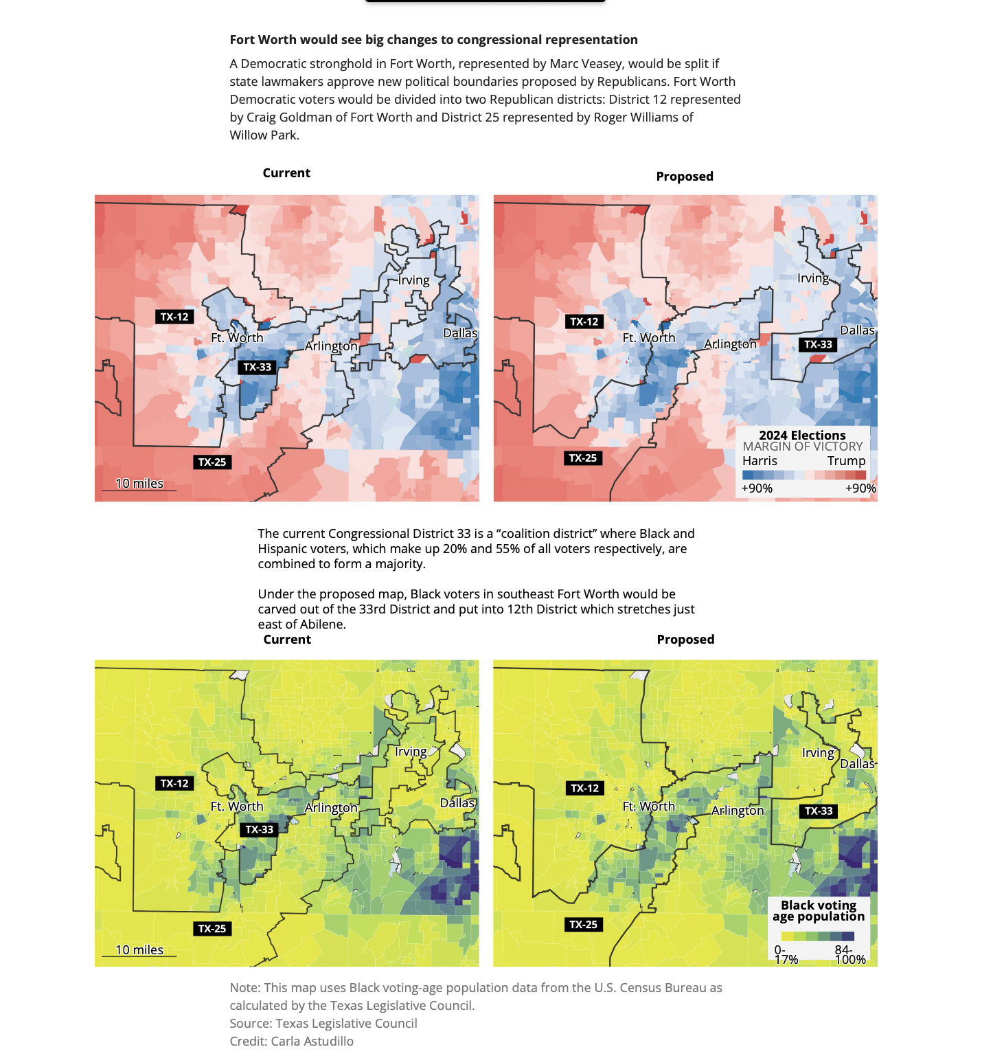 예를 들어, 포트워스 남동부 지역은 지난 10여 년간 민주당 소속 마크 비시 하원의원이 대표해 왔다. 그는 흑인과 히스패닉 인구가 밀집한 이 지역의 경제 개발을 위해 수백만 달러의 연방 자금을 확보하며 저소득층 주택 건설과 상업지구 활성화 사업을 이끌어 왔다. 그러나 새로운 선거구는 마크 비시 의원의 지역구를 농촌 지역과 분리 · 합병해, 전통적으로 민주당 비시 의원을 지지해왔던 지역구 유권자들의 정치적 결집력을 약화시킬 수 있으며 공화당 지지 인구가 대거 합류되면서 당선 여부도 불투명해진다.