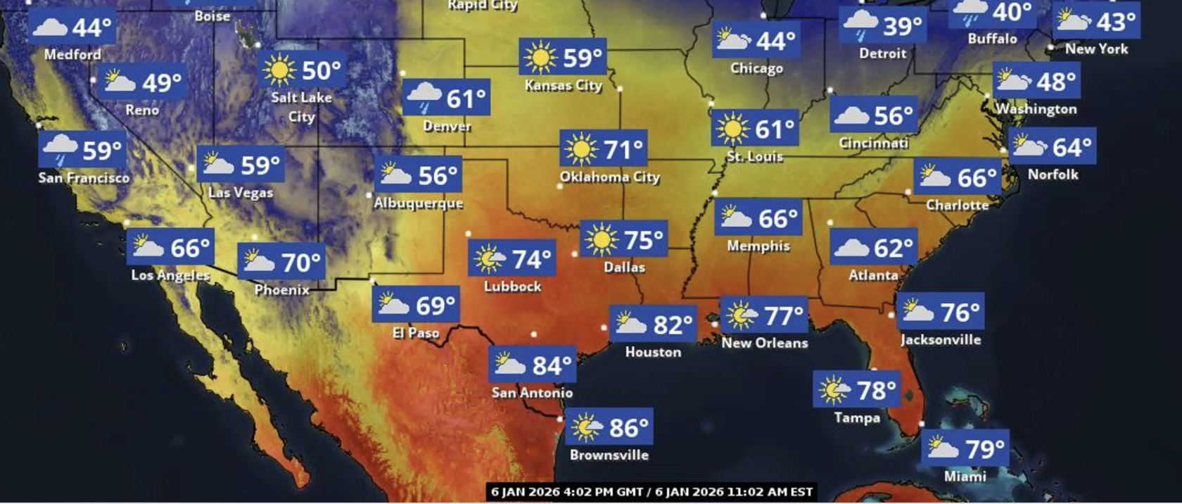 이례적인 고온은 목요일과 금요일까지 이어진 뒤, 주 후반 한랭전선이 텍사스를 통과하면서 기온이 점차 정상 범위로 내려갈 전망이다. 북텍사스부터 기온 하강이 시작돼 주말에는 주 전역에서 1월 평균 기온에 가까운 날씨가 예상된다.