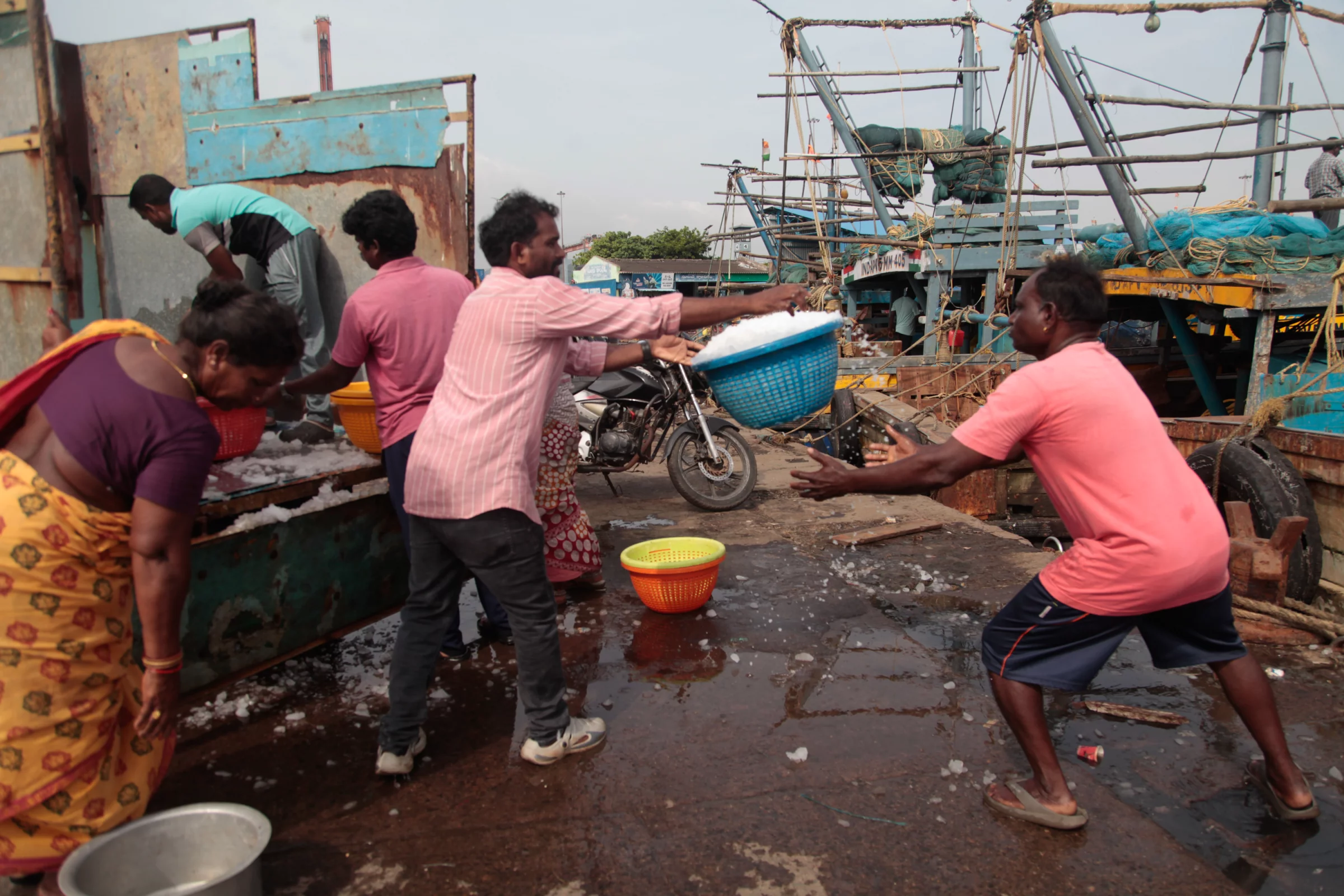사진/ NPR (Port workers toss baskets of ice to keep catch fresh at the port of Visakhapatnam. Diaa Hadid/NPR)