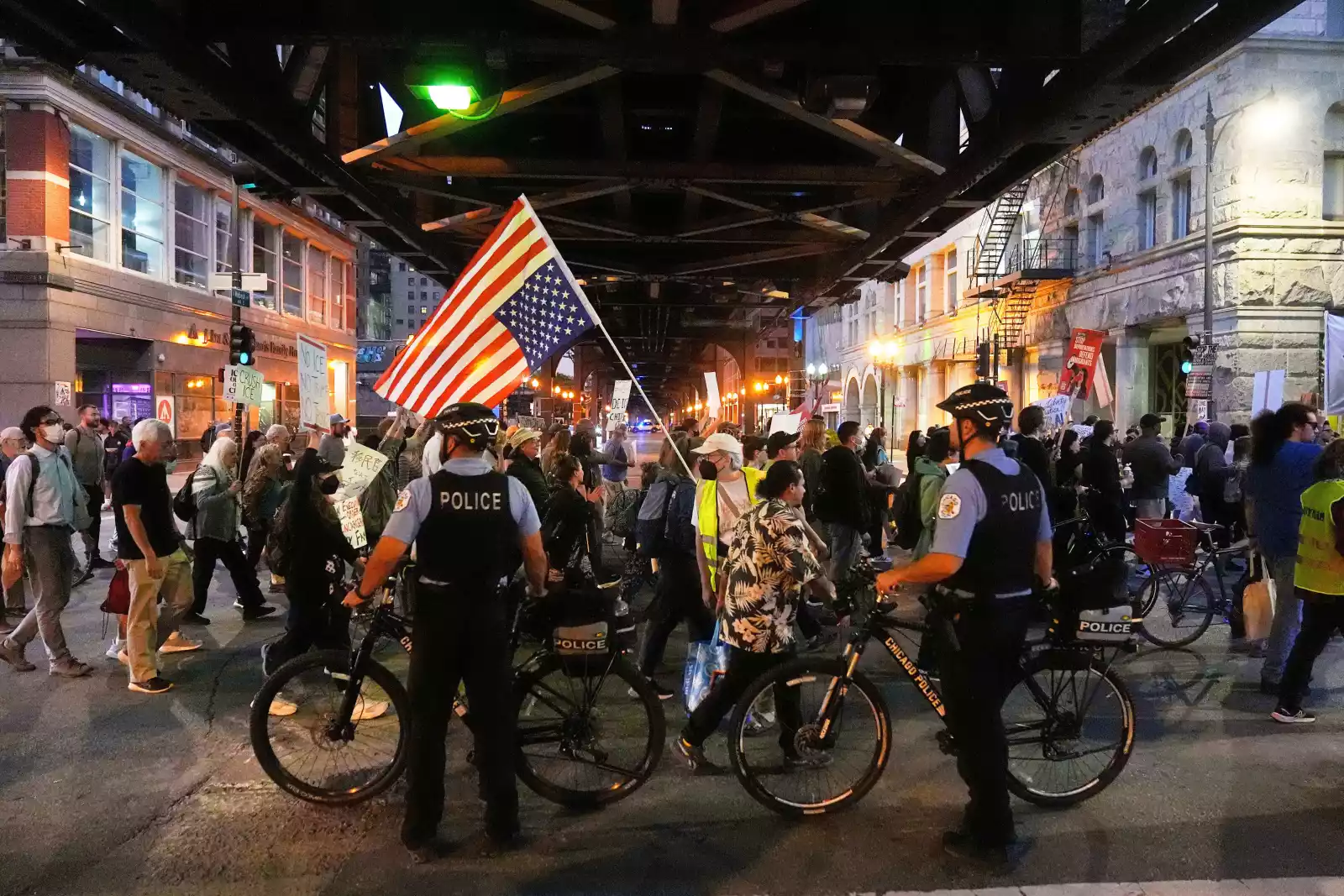 사진/ NPR (Police officers block a street as demonstrators march at a protest opposing “Operation Midway Blitz” and the presence of ICE, Sept. 9, 2025, in Chicago.Erin Hooley/AP)
