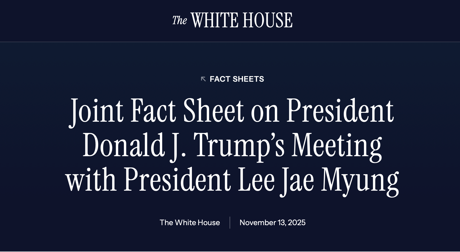 도널드 트럼프 미국 대통령과 이재명 대한민국 대통령이 지난 10월 29일 경주에서 정상회담을 가진 뒤 13일(목) 백악관이 발표한 공동팩트시트에 대해 미국 주요 언론들이 “한미동맹이 군사 중심에서 경제·안보 통합동맹으로 진화하고 있다”고 분석했다.