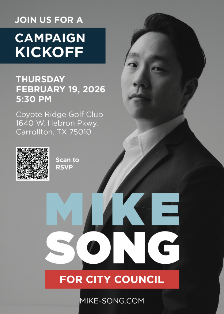[캐롤튼=텍사스N] 텍사스 한인 경제의 중심지로 불리는 캐롤튼에서 1988년생 차세대 리더 마이클 송(한국명 송호석·38) 후보가 시의원 제4석(At-large)에 공식 출사표를 발표하는 킥오프 행사를 개최한다. 오는 19일(목) 오후 5시 30분 캐롤튼 코요테 릿지 골프클럽(Coyote Ridge Golf Club, 1640 W. Hebron Pkwy.)에서 캠페인 킥오프 행사를 열고 본격적인 선거운동에 돌입한다.