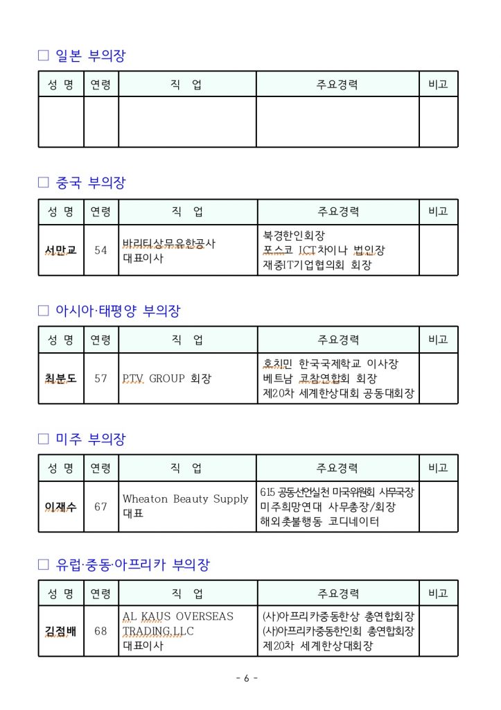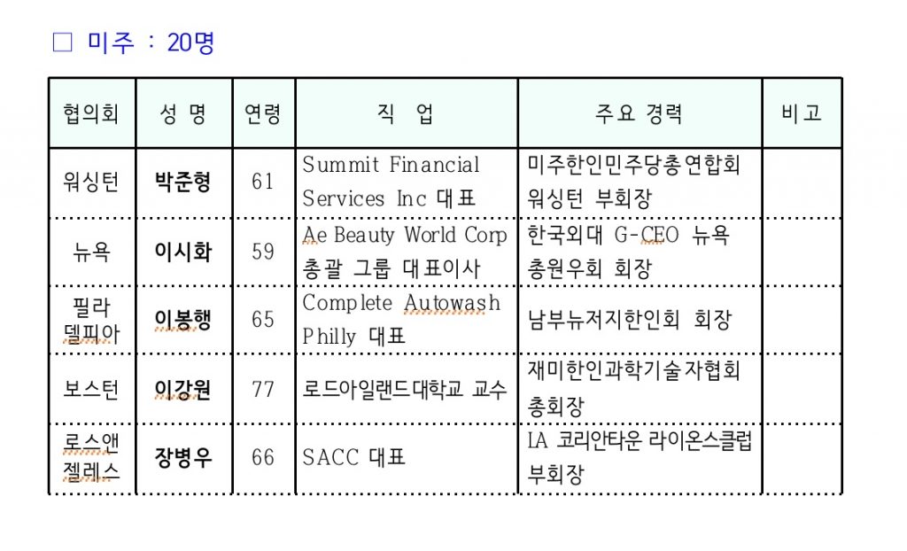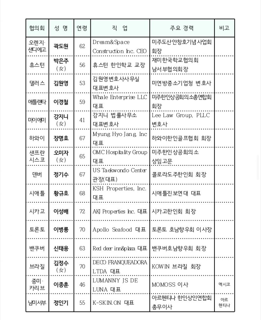 다음은 미주 지역 협의회장 및 부의장단 명단이다.