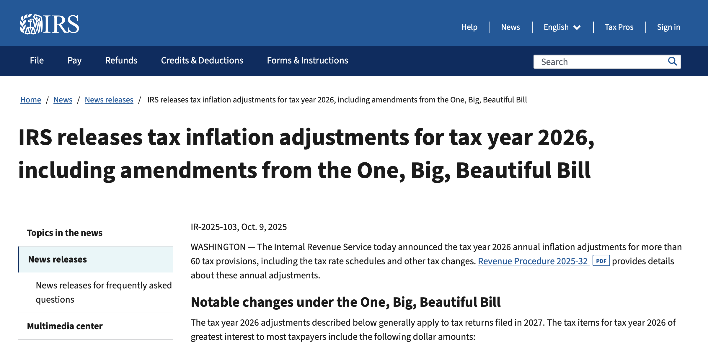 한편, IRS는 이번 수치를 담은 공식 문서 Revenue Procedure 2025-32를 통해 세부 계산표와 추가 지침을 공개할 예정이다.