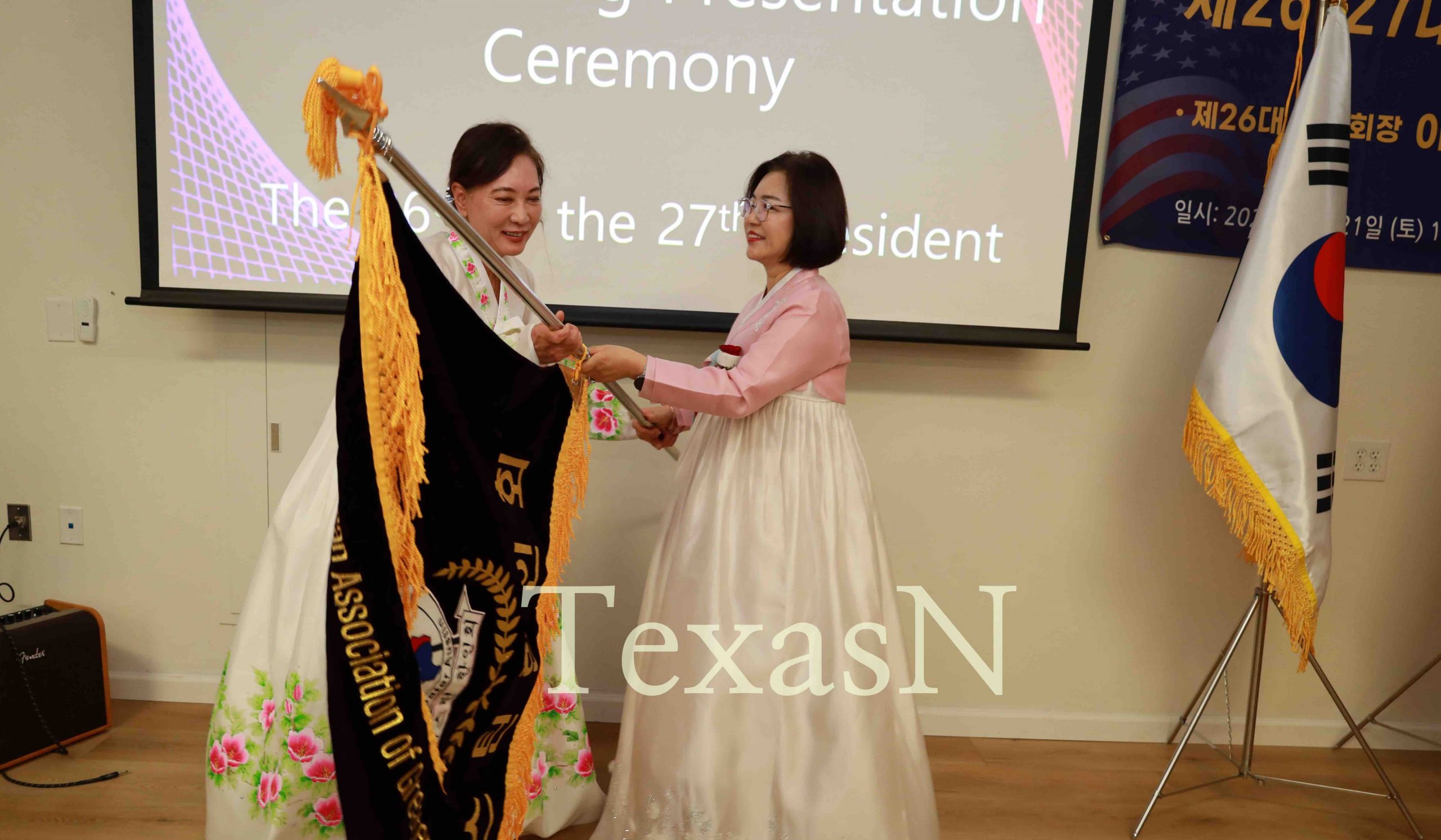 Former Korean American Association of Greater Austin President Lee Ok-hee (right) hands over the association flag to newly inaugurated President Kang Susie (left).